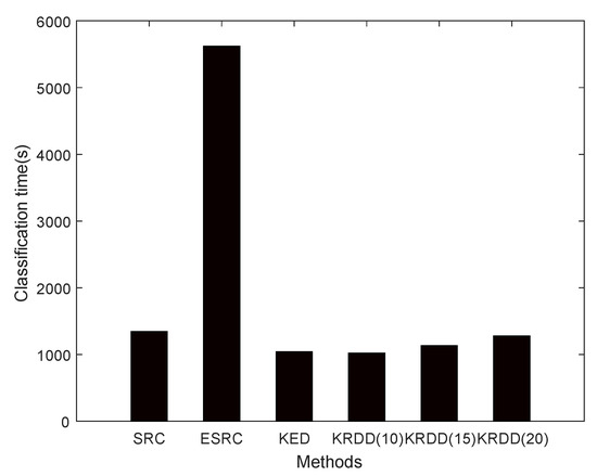 It can be seen in Table 5 that the recognition rate of the simple association of KDA and SRC is indeed nearly 20 % higher than the rate of KDA and SRC alone. However, KRDD is not a simple addition of KDA and SRC. The recognition rate of KRDD is approximately 5.8 % higher than that of KDA plus SRC and KDA plus ESRC. KRDD also achieves higher recognition accuracy than taht of KED. Among all the methods, KRDD achieved the best results. Figure 9 shows the classification time for several algorithms. Although ESRC has a higher recognition accuracy than SRC, it takes a much longer time because it expands the quantity of atoms in the dictionary. D in KRDD is based on low dimensions and only adds a small number of atoms, which is faster than SRC. It is remarkable that KRDD has a higher recognition rate and takes less time than KED for the same number of selected occlusion components. Additionally, a positive correlation could be observed between selected occlusion components and the recognition rate of KRDD. Nevertheless, selecting more occlusion components results in longer time computation times.