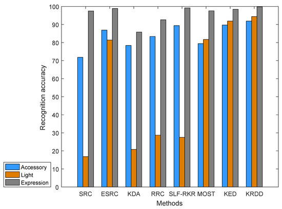 Since KRDD combines three algorithms: SRC, KDA, and PCA, it is not a simple stack of the three algorithms. To prove that KRDD is fundamentally different from SRC and KDA, KRDD is compared with PCA, SRC, ESRC, KDA, KDA + SRC, KDA + ESRC and KED. All methods were tested using LBP features. Again, PCA is applied to reduce the feature dimensions to 600, 700, and 800 to compare these advanced methods. In this experiment, KRDD learned from the first 10, 15 and 20 components of the real disturbance variable and the simulated disturbance variable in kernel space.