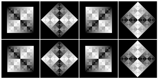 As previously described, the set of fractal masks is generated by combining two orthogonal grayscale ramp images using the XOR logical operation. The final masks are obtained by rotating the original fractal to the desired angle with no interpolation and allowing the black extra pixels to cover the entire image. The resultant filtering images can be seen in Figure 1.