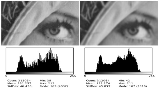 Detail of the Lena image with 8 × zoom using the nearest neighbor and fractal convolution, respectively, and their histograms.