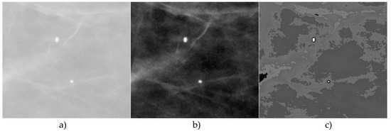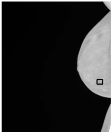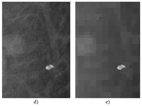As in the above-mentioned cases, analysis is focused on the ROI so that each microcalcification can be characterized. Figure 13 indicates the ROI to be analyzed, and the results are shown in Figure 14. In these cases, calcifications are more easily detected and their characterization would help to classify between malignant or benign lesions due to shape, as seen in Figure 15. In the original image, the microcalcification shape is barely noticeable. Nevertheless, shape becomes clearly discernible after applying the proposed segmentation. The processing steps are shown in Figure 15a–c.