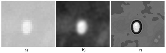 As seen in Figure 7a, the original zoomed image is pixilated, but mask convolution eliminates these artifacts. The result is shown in Figure 7b. Finally, mathematical operators (logarithm and exponential) were applied to copies of the processed ROI and their results were combined by the XOR operator. As shown in Figure 7c, the shape and dimensions of the microcalcification are well-enhanced. In Figure 8, the largest microcalcification was enlarged to detail its shape. The result of this segmentation process can be used for automatic classification, pattern matching, and machine learning postprocessing steps. The processing steps are shown in Figure 8a–c.