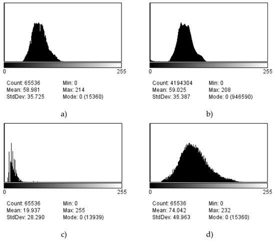 The histograms of the original ROI and the different processed images are shown in Figure 17 for comparison purposes.