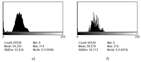 Histogram of ROI. (a) Original sample. (b) Processed image with a fractal mask and no contrast enhancement. (c) Image processed with a fractal mask and log-exp contrast enhancement. (d) Processed image with the CLAHE algorithm. (e) Processed image with the Atrous algorithm. (f) Processed image with the Haar algorithm.