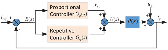 Various grid-tied current control techniques have been proposed to achieve the steady-state harmonics suppression. Among these control methods, the proportional-integral (PI) and proportional-repetitive (PR) control are popular methods [11,12,13,14]. The PI control scheme is commonly used in the stationary reference frame (SRF) for its simple control structure, ease of implementation, and good transient response [14]. However, a PI controller is unable to track a sinusoidal reference with zero steady-state error because of the limited control-loop gain [15]. It also lacks sufficient suppression ability for low frequency harmonics. On the other hand, the PR control technique, using the stationary reference frame, can efficiently overcome the aforementioned disadvantages of the PI control scheme. Thus, it possesses a high reputation in grid-connected control. The PR controller is composed of a proportional component like PI control and a resonant controller that acts as a sinusoidal integrator [12]. Theoretically, an ideal PR compensator introduces an infinite gain at resonant frequency, which is equal to grid frequency, to achieve a good sinusoidal reference current tracking effect. However, a PR controller will cause periodic disturbances at frequencies distinct from its resonant frequency and is unable to turn its control gain independently. The proportional multiple resonant control scheme together with its improved design can address the issue of multi-frequency harmonics compensation efficiently [16,17,18,19]. However, there is no doubt that multiple resonant (or quasi-resonant) controllers will lead to computational cost and significantly increase implementation complexity [20]. The repetitive controller (RC) has been presented with a simplified control structure, tracking many harmonics simultaneously. For the design of repetitive control, the control plant can be simplified as a single-input-single-output system. As a result, the design complexity is greatly reduced, and the stability assessment becomes easier. However, it cannot satisfy the requirements of dynamic response in renewable energy generation [21].