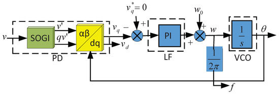 In order to synchronize the grid-connected inverter output current frequency and phase with the grid voltage, the grid current reference signal tracking the phase and frequency accurately and quickly of the grid voltage should be ensured at first [27]. Therefore, the phase-locked loop (PLL) achieves a high sinusoidal current reference signal through phase negative feedback control. At the same time, the system uses the PLL to monitor the parameters of the grid voltage (such as the grid voltage amplitude and frequency), so as to guarantee the working performance and state of the grid-connected inverter.