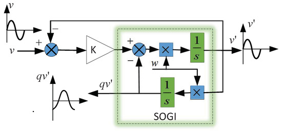 The SOGI-based orthogonal signal generator (OSG) structure diagram is shown in Figure 7. It generates a pair of orthogonal signals, where the amplitude, phase, and frequency of the output signal are equal to the input signal v. The other output virtual voltage signal is delayed by from the signal . The SOGI transfer function can be expressed as: