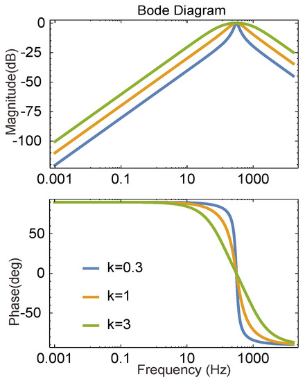 These transfer functions show that the bandwidth of the closed-loop system is directly determined by the gain k and is not affected by the resonant frequency , which means the grid frequency fluctuation has little effect on the system. Take the function as an example, when the gain k takes different values, the obtained Bode plot is shown in Figure 8, where the green, orange, and blue lines correspond to k = 0.3, k = 1, and k = 3, respectively.