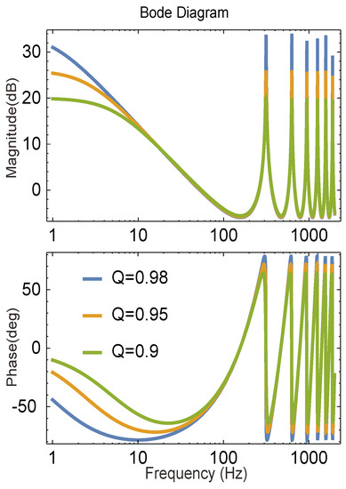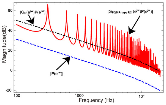 where is the RC gain and is the time delay. is a low-pass filter or a simple constant slightly less than one to improve system stability and robustness. is the cut-off angular frequency, and . can be ignored due to . Equation (13) shows that the repetitive controller contains a limitless number of MQR controllers. In order to improve the system dynamic response, a proportional controller is selected to connect in parallel with the RC, which forms the PMQR-type RC, as shown in Figure 3. The parallel structure of different controllers perhaps affects the dynamic response of the system. However, it seems that the relatively slow RC will not affect the quick response performance of the proportional controller in the parallel configuration [25]. It is worth noting that the repetitive controller should be designed for the frequency characteristics of its control plant. And the parallel structure will provide a more friendly plant for the repetitive controller. As can be seen from the Figure 4. the transfer function of the new plant can be expressed as: