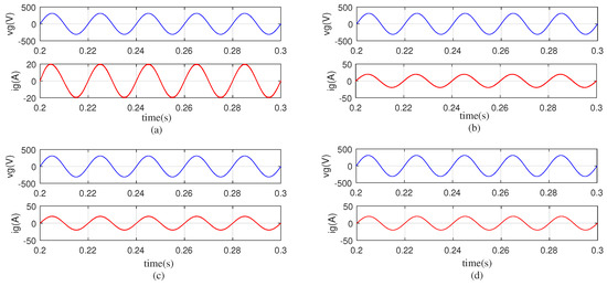 Simulations were carried out with Simulink in MATLAB software. The sampling time was set as s. The rated output power was 3 kW, and the average output current was about 14 A. In the SRF, the proportional controller was used to provide higher control gain. The repetitive control was mainly responsible for compensating the harmonics. In order to confirm the superiority of the proposed PMQR-type RC scheme, the simulations of a variety of classical control scheme were carried out for comparison. All simulations were tested on the single-phase grid-tied H6-type inverter with SOGI-based PLL. The parameters are listed in Table 1, and the given current reference amplitude was set at 20 A.
