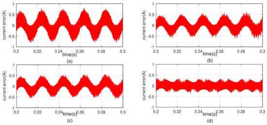 The current tracking error in the steady-state with different controllers. (a) With PI controller. (b) With PR controller. (c) With repetitive controller. (d) With PMQR-type RC controller.