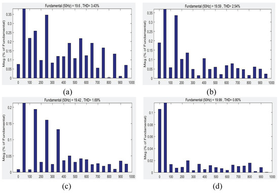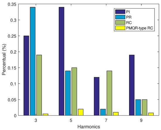 Figure 19 is the FFT analysis diagrams of H6 inverter output current with different control schemes. Obviously, the magnitude of the output current harmonics was significantly decreased under the operation of the PMQR-type RC controller. Figure 20 compares the THD values under different control strategies. As can be seen in Figure 20, the THD value of the PMQR-type RC strategy was the minimum, which was only 0.80%. The THD values for the PI, PR, and RC schemes were 3.43%, 2.54%, and 1.69%, respectively. Figure 21 involves the individual amplitudes of odd-numbered low frequency harmonics. Obviously, the multi-frequency harmonics obtained a perfect suppression by using the proposed controller compared with others, and the third harmonic content was almost zero. All these figures mean that the harmonic suppression capability of the proposed controller was more powerful than others.