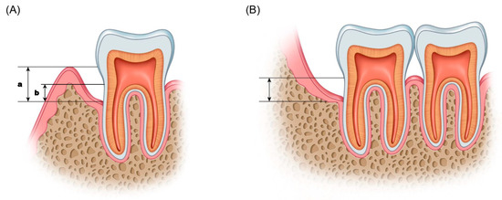 Schematic illustration for measurements. (A) Pocket depth is defined as the distance between the free gingival margin and the bottom of the periodontal pocket (indicated as (a)). Clinical attachment level is defined as the distance between the cementoenamel junction and the bottom of the periodontal pocket (indicated as (b)). (B) The amount of bony defect was defined by the distance between the cement-oenamel junction of the second molar and the bottom of the bony defect in the distal surface of the second molar.
