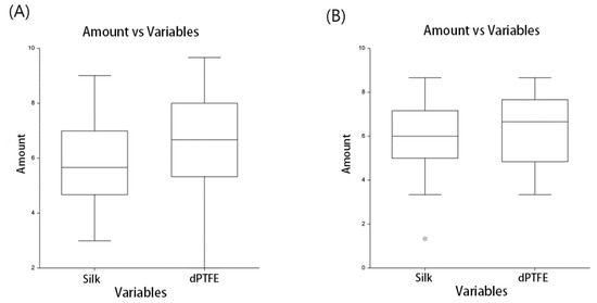 Silk mat consists of fibroin and sericin protein. Silk fibroin has been widely studied for bone regeneration [28]. Sericin has been considered industrial waste, but its beneficial effect was illuminated recently [38,39]. Because sericin is hydrophilic protein and easily fragmented in aqueous solution, silk mat can be considered a drug carrier-releasing sericin [25]. All silk mats in this study came from the middle layer of the silkworm cocoon. In previous studies, the amount of fragmented sericin release was smallest in the middle layer [25,26]. The expression level of tumor necrosis factor-alpha (TNF-α) from macrophages depends on the sericin concentration [25]. Activation of osteoblasts depends on the expression level of TNF-α from macrophages [25]. In comparative animal studies, silk mat has shown levels of bone formation similar to collagen and dPTFE [27]. In this clinical trial, GBR with silk mat showed levels of periodontal regeneration similar to GBR with dPTFE.