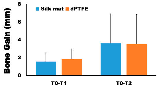 The amount of bone gain (BG) at three months (T1) and six months after tooth extraction (T2) compared to before tooth extraction (T0). There was no significant difference in BG between the silk mat and dPTFE groups at T1 and T2 (p > 0.05).