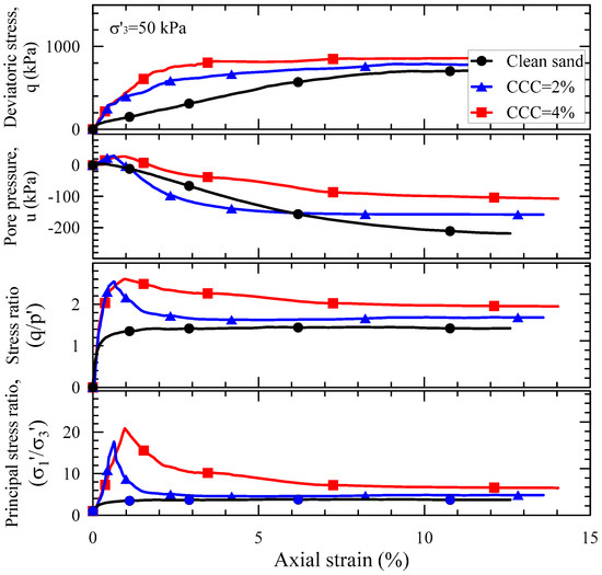 Table 2 summarizes the testing conditions and compares the peak values and hydraulic conductivity. Figure 2 shows a typical result of the undrained triaxial test on sand with and without calcite treatment and a confining stress of 50 kPa. Deviatoric stress and mean effective stress are defined as q = σ′1 − σ′3 and p’ = (σ′1 + 2σ′3)/3, respectively. The stress–strain curve for untreated sand showed a continuous hardening behavior, but for treated sand showed stiffer behavior at the initial loading stage. A positive excess pore pressure was generated initially, but this became negative due to dilation regardless of the CC. As the CC increased, the dilation decreased due to the cemented particles. O’Donnell and Kavazanjian [13] obtained similar results for biocement with MICP. The relationship between the stress ratio (q/p’) and axial strain is shown in Figure 2. The ratio for the untreated sand reached a peak value and then remained constant. On the other hand, the ratio for the treated sands reached a peak and then decreased slightly. The trend for the principal stress ratio (σ′1/σ′3) was similar to that of the stress ratio, as shown in Figure 2. This kind of stress–strain behavior has also been observed [23].