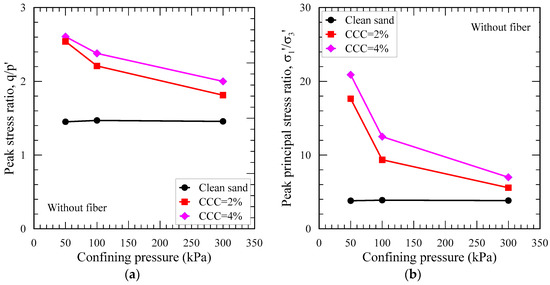 Figure 6 shows the relationship between the peak stress ratio and peak principal stress ratios versus the confining pressure. The peak stress ratios of the treated sand with fiber were much higher than that of the sand without fiber. The peak stress ratios were less affected by the fiber content.