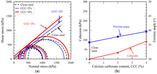 Figure 4a shows the Mohr’s stress circles at different confining pressures. The friction angle and cohesion were obtained from the Mohr’s stress circles and compared for different CCs. Table 3 summarizes these strength parameters. As the CC increased, both the cohesion and friction of the treated sand increased due to the cementation of sand particles [23,24]. In general, the friction angle of sand can be influenced by the relative density, particle size, and shape of the sand. In addition to the cementation effect, the shape of the sand became angular due to precipitated calcite, which may also have contributed to the increased shear strength.