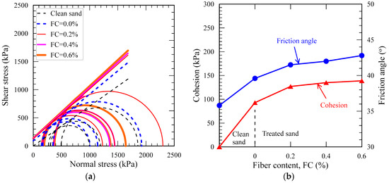 Figure 7a shows the Mohr’s stress circles and failure envelope for the treated sand with and without fiber under three confining pressures. From these stress circles, the cohesion and friction angle were calculated and are compared in Figure 7b and Table 5. Both the cohesion and friction angle increased as the fiber content increased. The strength gradually increased up to a fiber content of 0.2% and then it remained constant. In this study, the optimum fiber content was approximately 0.4%. Choi et al. [18] discovered that the UCS rapidly increased as the PVA fiber content increased up to 0.8% when the CC was high. Li et al. [17] showed that the shear strength of MICP treated sand with polypropylene fiber increased up to a ratio of 0.3%. Therefore, the optimum fiber content for sand treated by MICP could be influenced by the CC and testing methods.