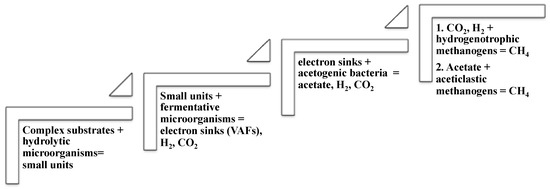 Hydrogenotrophic methanogens play a key role in the overall process as Archea maintain a low partial pressure of H2 (<10 Pa), necessary for the metabolic activity of aceticlastic methanogens and acetogens. Hydrogenotrophic methanogens, such as Methanospirillum hungatei, Methanoculles receptaculi, grow faster (doubling time of 6 h) than the aceticlastic methanogens, such as Methanosarcina thermophile, (doubling time of 2.6 days). As for pH value, the production of methane is affected by the low pH value. In order to support the growth of both acidifying and methanogenic bacteria, the pH value has to be above 6.6 and ideally 7–7.5 [10,11] as methanogens are very sensitive to environmental changes and prefer a slightly alkaline environment (at pH below 6 methanogenic bacteria cannot survive). Inhibitory compounds, such as sulphide, or lack of nutrients can negatively affect the growth and activity of these microorganisms, resulting in the accumulation of VFAs and a subsequent decrease in pH, which further inhibits the entire degradation process.