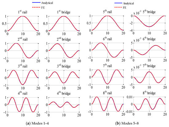 The discrete spring model for the rail-bridge system is established by the FE method and the numerical frequencies and mode shapes of the system are obtained. They are compared with the analytical counterparts calculated from the formulae for the distributed spring model in Section 2.1. The rail and the bridge are modeled by 256 beam elements in the FE model. 31 discrete spring elements having the stiffness of N/m and the space of 0.625 m are created to model the discrete springs. The first 16 frequencies of the double-beam system are obtained by the FE method and compared with the analytical results as shown in Table 4. The differences between the two kinds of results are very small. To save page, only the first 8 mode shapes are depicted for comparison in Figure 2. The differences between the mode shapes obtained by the two methods cannot be distinguished. The above comparisons verify the analytical formulae in Section 2.1. It is interesting to find that the 5th mode shape is similar to the 1st except that the amplitude and direction of the bridge mode shape are different. The similarities can also be found between the 6th and the 2nd, the 7th and the 3rd and the 8th and the 4th mode shapes. In fact, the two similar modes are the two sub-modes corresponding to the same basic mode with the same wavenumber. The four sets of similar modes are corresponding to the first four basic modes. More studies about sub-modes are presented in Section 2.3.