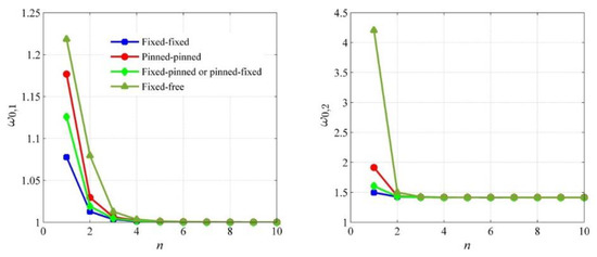 Figure 3 shows the effect of the order of the basic mode (n) on the frequency ratios in two sub-modes () for different boundary conditions when , and . It can be seen from the figure that and vary obviously with boundary conditions in the 1st basic mode. The effect of n on the frequency ratios is small when n is large. Figure 4 shows the effect of n on the mode amplitude ratios in two sub-modes . is always positive and is always negative, which indicates that the modes of two beams are always in-plane with each other in the 1st sub-mode, whereas the modes of the primary beam are always anti-plane with the modes of the secondary beam in the 2nd sub-mode. tends to be very small with the increase of n and decreases dramatically after the 4th basic mode, which means that the double-beam system tends to behavior like two individual beams. While varies a lot with boundary conditions in the 1st basic mode, differs obviously with boundary conditions when n is larger than 5.