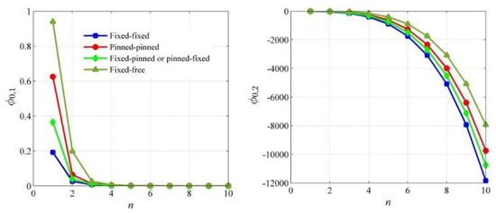 Equations (34) and (35) result in the same solution for Equation (13). If Equation (34) is chosen, the solutions of in the first six modes are as in Table 2.