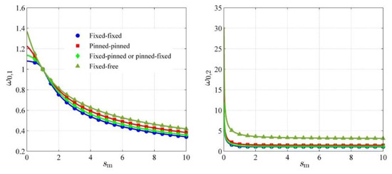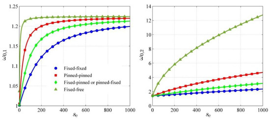 The frequencies of the fixed-pinned double-beam systems can be worked out by substituting the values of in Table 2 into Equation (9).