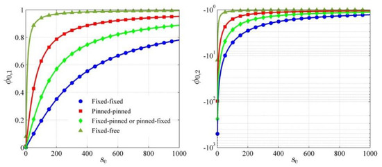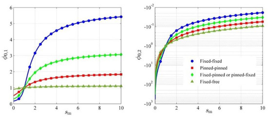 Det [] = 0 results in the same equations as Equations (34) and (35), so the solutions of , and frequencies of the pinned-fixed double-beam systems are the same as the fixed-pinned double-beam systems. The mode shapes of the secondary beam of the pinned-fixed double beam systems are obtained by solving Equation (16) to be