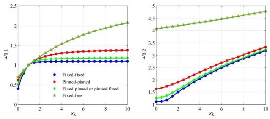 The effect of the contact stiffness ratio () on the frequency ratios () in the 1st basic mode for different boundary conditions when and is plotted in Figure 5. It can be seen from the figure that and increase monotonically with . increases dramatically when is small. The increasing rates of and are larger for looser boundary conditions when is smaller. Boundary conditions have a bigger influence on than . Figure 6 shows that both and increase with and the increasing rates of and are very large when . is small. In addition, the increasing rates of and are larger for looser boundary conditions when is smaller.