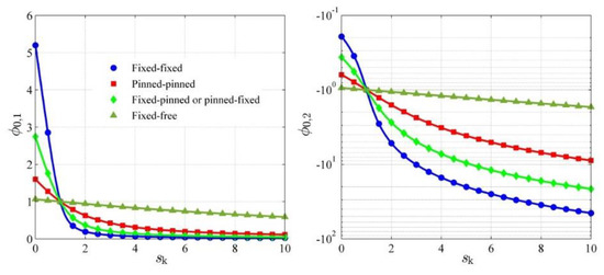 It is noticed again that the solutions for in Equation (26) or the solutions for in Equation (27) are the same as the wavenumbers for a single beam with pinned-pinned boundary conditions.