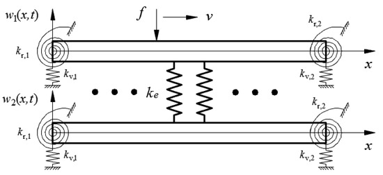 Hamada et al. [5] pointed out the similarity between an elastically connected multi-beam system with same boundary conditions for all the beams (symmetric boundary conditions) and a multi-degree-of-freedom mass-spring system. The free vibrations of an elastically connected double-beam system, taking account of the axial forces on the beams were studied in References [30,31]. Li and Sun [32] presented a semi-analytical method to study the transverse vibration of an undamped elastically connected double-beam system with arbitrary boundary conditions. The transverse vibrations of a double-beam system interconnected by a viscoelastic layer were studied numerically [33]. The two beams can be restricted with different boundary conditions. Şimşek and Cansız [34] studied the vibrations of elastically connected double-functionally graded beam systems with different boundary conditions under the action of a moving harmonic load by a numerical method. Zhang et al. [35] developed an analytical framework to study the transverse vibrations of double-beam systems made of two parallel Timoshenko beams connected by springs and coupled with various discontinuities.