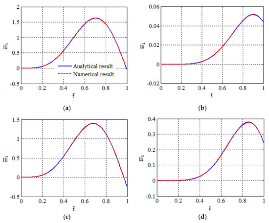 The Newmark-Beta integration method is adopted to obtain numerical solutions of Equation (52) and compared with its analytical solutions. It is found in computations that using only the first basic mode (m = 1) is good enough to reach satisfied accuracies for the fixed-fixed double-beam system. For comparison, only the first basic mode is used in the following analyses for other kinds of boundary conditions. Figure 12 shows the comparisons between the results by the two methods for the dimensionless speed () of 0.5 and contact stiffness ratios () of 10 and 100. It can be seen from the figure that the two kinds of results have very good agreements. In addition, it can be found that the maximum displacement of the secondary beam () is smaller than that of the primary beam () and the instants for lag behind those for . When becomes larger, the difference between and is smaller.