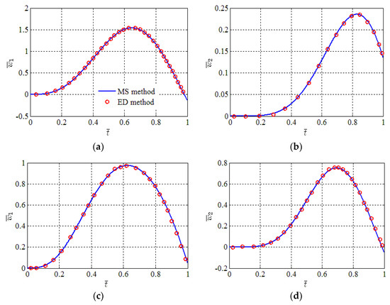 Comparison between the results from the Modal Superposition (MS) method in this study and the results from the Equation Decoupled (ED) method by Hilal [19] for , (a,b) , (c,d) .