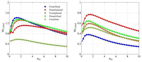 Figure 16 shows maximum dimensionless displacements () and () versus the mass ratio () for different boundary conditions when , and . It can be seen from the figure that increases firstly and then decreases with . In addition, the difference between and is smaller for looser boundary conditions.