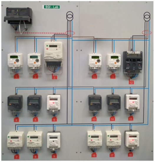 The testbed used is a small-scale first generation AMI system, and the experiments are conducted in the lab environment. One data concentrator is used, and 12 single-phase smart meters were chosen from the available ones for the experiments. Figure 5 shows the testbed used for this work. The test bed includes 18 meters including 2 triphase ones. For this experiment, only twelve residential smart meters were used, which communicate with the data concentrator using Power Line Communication technology (PLC). They communicate with the PRIME protocol which is a popular option in some Member States of the European Union for power line communication. The data concentrator software allows the interrogation of the smart meters to request measured values, such as power, current and voltage values at a predefined periodicity.