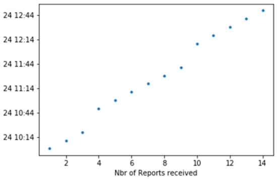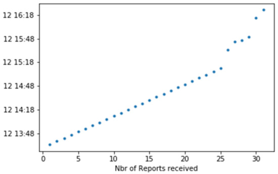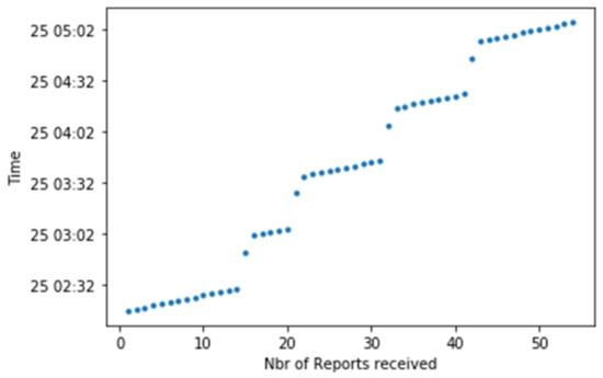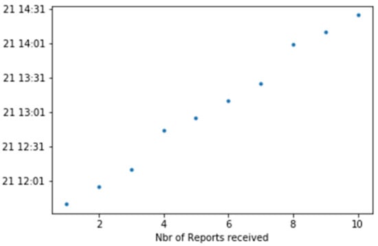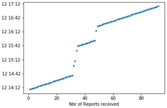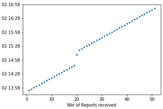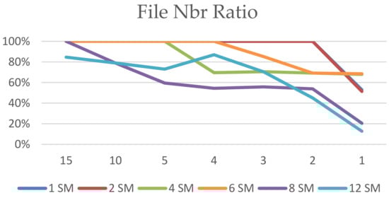 In general, the performance of the system deteriorates by increasing the number of smart meters in the test. However, some non-monotonic behaviour is observed which, in our opinion is due to the presence of stochastic and unpredictable factors that influence the system under analysis (that may cause connectivity problems). The success ratio was, in many cases, lower than 100% because not all files were received with respect to what was expected and, even when all the files were received, many times they did not contain all the information that the smart meters are supposed to send to the data concentrator. To depict better the situation, graphs are displayed with the number of files recorded during the experiment execution for each parameter’s configuration where a disruption in the files recording is initiated. Figure 9, Figure 10, Figure 11, Figure 12, Figure 13 and Figure 14 depict this situation for 12, 8, 6, 4, 2 and 1 smart meter, respectively.