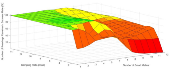 Visual representation of the success ratio of the number of readings received as a function of the number of smart meters connected to the data concentrator and the smart meters’ sampling rate.