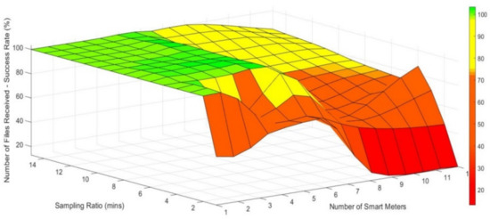 Visual representation of the success ratio of the number of files received as a function of the number of smart meters connected to the data concentrator and the smart meters’ sampling rate.