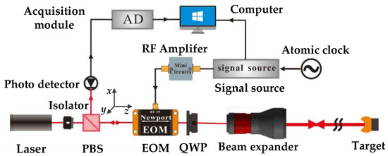 The frequency-sweep polarization-modulation ranging system consists of a continuous wave laser, an isolator, a polarizing beam splitter (PBS), an EOM, a quarter wave plate (QWP), a beam expander (EXP) and the target, as shown in Figure 1.