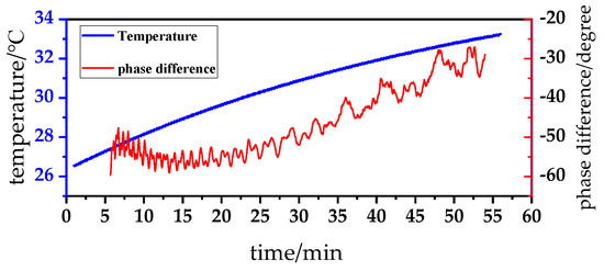 In our experiment, the residual thermally induced phase delay was tested first. Since thermally induced phase delay varies slowly, it can be measured through a polarization analysis system (Thorlabs, PAX5710). At the same time, the temperature in the modulator chamber was tested with a high-precision temperature controller (Wavelength, Tc_lab), with results shown in Figure 2. As is shown, with the increase of temperature, the phase delay slowly increased, accompanied by periodic oscillation, and when temperature growth slowed down, the oscillation speed also decreased.