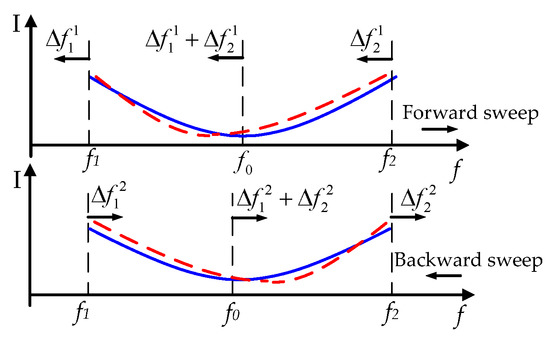 Suppose the ideal frequency under test is f0. f1 and f2 are frequencies very close to f0 and satisfy the equations f1 = f0 − δf and f2 = f0 + δf. If the system is not affected by thermally induced phase delay, obviously we get the equation I(f1) = I(f2), then the exact value of f0 can be worked out through: f0 = (f1 + f2)/2. However, due to thermally induced phase delay, during the forward sweeping, f1 and f2 respectively moves and towards lower frequency, then in the backward sweeping, f1 and f2 respectively moves and towards the opposite side, as shown in Figure 3.