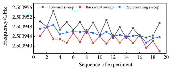 To evaluate the method of reciprocating sweep in compensation of thermally induced phase delay, an “in phase” frequency was obtained by different methods and results are shown in Figure 4. In the figure, black and red dots respectively denote the results obtained through forward and backward sweep, and blue dots denote the average of measurement results obtained by the reciprocating sweep. Results obtained through forward and backward sweeps drifted in opposite directions, and the forward sweeps had a larger statistical average than that of the backward sweeps. Through reciprocating sweeps, the results had a repeatability of 1727 Hz, which was much smaller than that of forward sweep (3130 Hz) and backward sweep (2503 Hz).