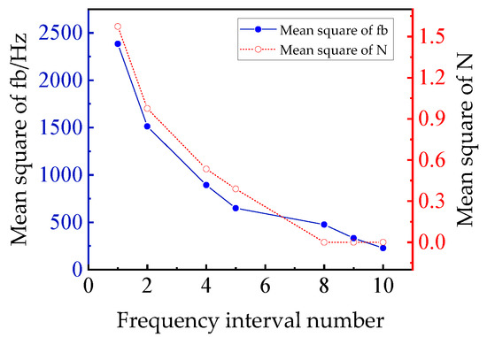 To validate our measurement method of N, N was tested with multi-frequency intervals. The “in phase” frequency fx near the lower edge of band was first obtained in the reciprocating sweep method, then, the uth “in phase” frequency on its upper side was obtained, and fb and N were respectively determined according to Equations (10) and (11). u was set to change from 1 to 10 in seven groups of tests, each group of tests contained 10 independent measurements; the statistical results are shown in Figure 5. In the single-frequency interval method, the mean squares of fb and N were 2384 Hz and 1.5, respectively. As u increased from 1 to 8, the mean square of fb was reduced to 332 Hz, and the mean square of N was reduced to 0. Further increase of u would result in further reduction of the standard deviation of fb, but in our experiment, the frequency interval number of 8 was sufficient for an accurate measurement of N.