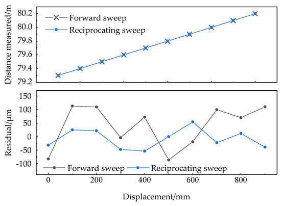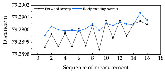 With the accurate measurement of N, distance could be determined through the “in phase” frequency and the corresponding N; results are shown in Figure 6. The statistical average of the forward sweeps was 6 µm larger than the backward sweeps. The statistical uncertainties of the forward sweeps and reciprocating sweeps were 87.1 µm and 44.1 µm, respectively.