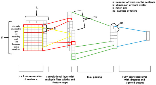 The architecture of the text classification is shown in Figure 3. We transformed words into a k-dimensional vector. We set the number of words to make an input matrix, denoted as n. A sentence is tokenized and n words organize the input data. At the end of the sentence, there could not be enough words to fill the input. In this case, we pad the rows with zeros until the number n is filled.
