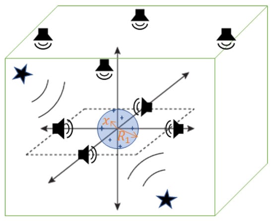 In this section, we formulate the ANC problem in the wave domain to cancel the noise over a 3-D spatial region inside rooms. As shown in Figure 1, let the quiet zone of interest (blue area) be a spherical region (S) with a radius . Assume that the noise sources (black stars) and the secondary sources (black loudspeakers) are located outside the region of interest. In the ANC process, we measure the noise field by placing a spherical microphone array (dark blue stars) on the boundary of the control region (i.e., the desired quiet zone).
