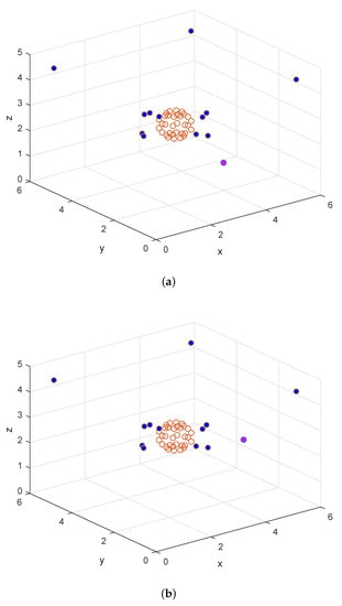 ANC system setup, where the pink point is the noise source position, blue points are loudspeaker positions, and red points are microphone positions: (a) case 1; (b) case 2.