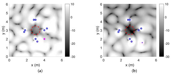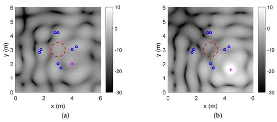 Energy of the primary noise field, where pink point is the projection of the primary source on the x-y plane, blue points are the loudspeaker points located on the x-y plane, and the red dashed circle is the boundary of the region of interest: (a) case 1; (b) case 2.