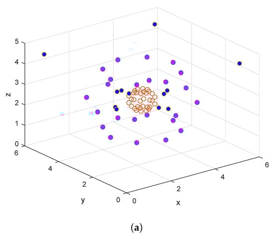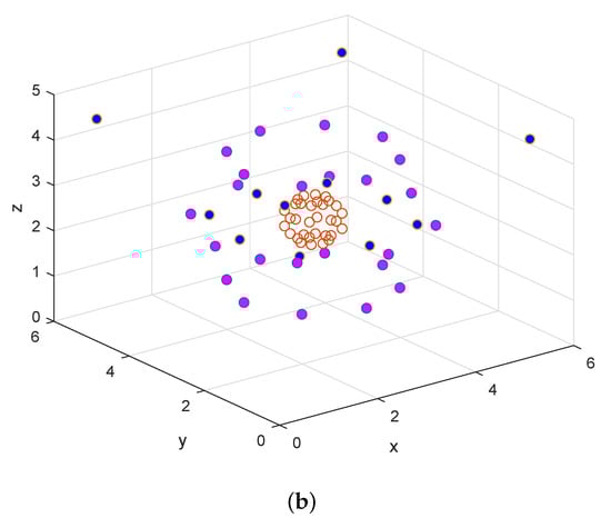 blue points are the loudspeaker points located on the x-y plane: (a) the WDLS method in case 1; (b) the